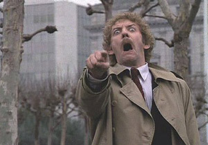 The original screenplay for the 1956 Invasion had a rather dark ending, with the Kevin McCarthy character screaming at passing trucks filled with seed pods, but the producers wanted — and got — a more upbeat ending in which an alarm is raised just in time to save the world. I personally prefer the darker ending in the 1978 remake starring Donald Sutherland. In the last scene of this version, Veronica Cartwright's character slips up to Donald Sutherland and whispers to him about her recent experiences evading the sneaky aliens. The supposedly trustworthy Donald Sutherland character suddenly points at her and emits an unmistakably alien scream of alarm (see picture this page). Much better.
