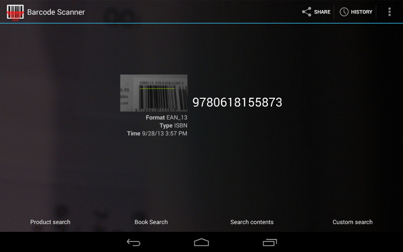 The test of correct settings is to pick up a book published in the last 20 years and scan its barcode. If the settings are right, the program will autofocus, scan, beep, and show a large reproduction of the ISBN code (and copy the code onto the Android clipboard). To move on to the next scan, reactivate the scanner by pressing the left-arrow symbol on the Android display.