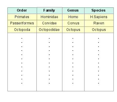Figure 1: Flat table databaseThe drawback to such a system is that, as records are added, errors can and will be made — a species may not belong to the genus to its left, or a genus to the family to its left, ad infinitum, and unless someone carefully researches each entry, errors are inevitable.