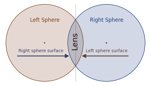 Left-Right Reversal: At this point, you may wonder why an entry defining the left-hand sphere's radius had its effect on the right hand side of our lens. The answer is that, as explained above, a lens is defined by two overlapping spheres (see Figure 1 above), and the right-hand surface of our lens is defined by a sphere centered to the left of the lens, and vice versa.