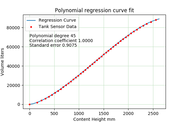 Figure 1 shows a typical polynomial regression result, in which the red data points (representing field measurements) are matched with a mathematical function (represented by the blue line) created by the method used in TankFlow.