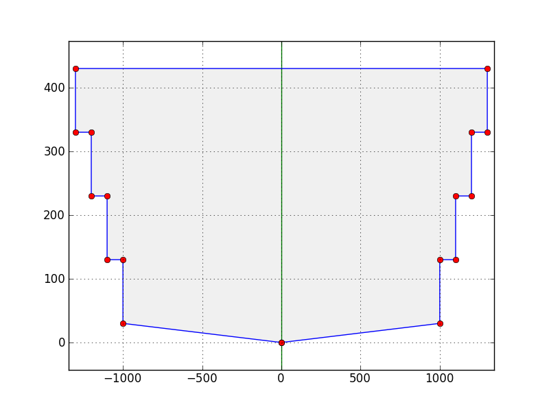 Remember that the y coordinates are radii, not diameters. With the above information, TankProfiler will model a tank that looks like this (this image is generated by TankProfiler):