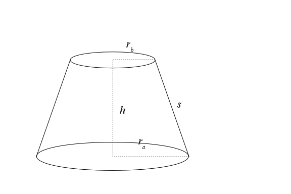 (10) $ \displaystyle v = \frac{1}{3} \pi h (r_a^2 + r_a r_b + r_b^2)$