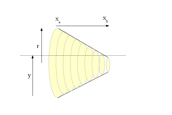 The above equation is the key to the numerical integration method used in TankProfiler to compute frustum partial volumes in the horizontal mode. For tank sections that are in essence conical frustums, the numerical method uses this general scheme (for simplicity some details are left out):