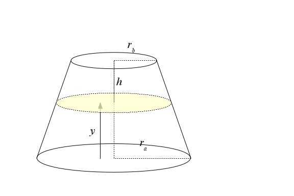 (11) volume v for sensor height y: $ \displaystyle v = \frac{{\left(3 \, h^{2} r_{a}^{2} y + {\left(r_{a}^{2} - 2 \, r_{a} r_{b} + r_{b}^{2}\right)} y^{3} - 3 \, {\left(h r_{a}^{2} - h r_{a} r_{b}\right)} y^{2}\right)} \pi}{3 \, h^{2}}$(12) sensor height y for volume v: $ \displaystyle y = \frac{h r_{a}}{r_{a} - r_{b}} - \frac{\left(\frac{{\left(\pi h r_{a}^{3} - 3 \, {\left(r_{a} - r_{b}\right)} v\right)} h^{2}}{\pi}\right)^{\frac{1}{3}}}{r_{a} - r_{b}}$![]()