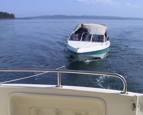 This year I was involved in two rescues. One was near Port McNeill, B.C., in Johnstone Strait, a small rental fishing boat that, there it is again, "became disabled" with an unknown cause (see picture on this page), three people on board. What I found surprising about this rescue was that towing this disabled boat only reduced my boat's speed by 1/2 knot. It wasn't a very large boat, but still, I found that surprising.