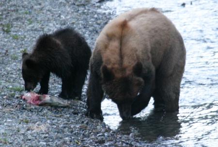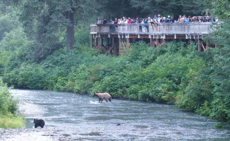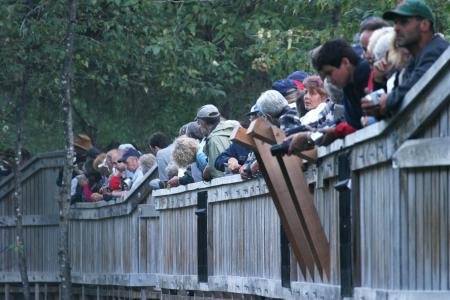 But this rant about tourists is mostly posturing, since I am also a tourist, and a lazy one at that. After all, I could be pure — I could paddle through Alaska, carrying some camping gear and a little food in my kayak, instead of driving a big power boat that has a kayak on top for the occasional day-paddle. Look at the picture of the silly bear viewing area on this page, the one with the human/bear ratio of about 1000/1. I think it's ridiculous and rather funny, but ... I was there too, wasn't I?