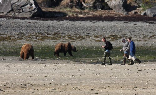 This year, a new phase started — wealthy people are flown to the bear site in a float plane, then walk around on shore, much closer to the bears than in years past (Figure 2). In one case, a party moved close to the bears, turned around, and faced the camera for a group picture — themselves and the bears.