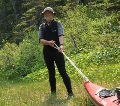 Some may think dragging a kayak across the land is more work than simply walking unladen — isn't this just a way to burn calories? Well, actually, no — in environments like that described above, a mixture of lakes and ponds joined by stretches of land, you can't get very far without some kind of boat, and paddling across a pond is way less work than walking the same distance in typical Alaska brush. It's a matter of choosing the right kayak (mine is Kevlar and only weighs 38 pounds) and not carrying too much gear.