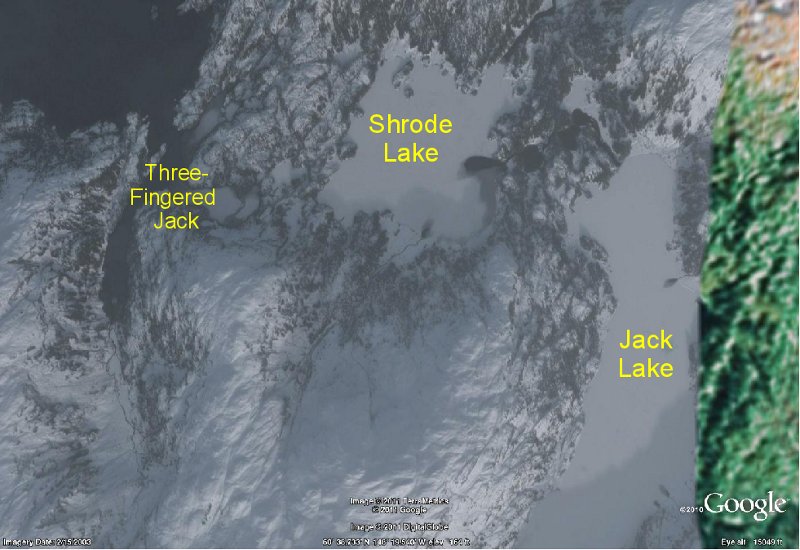 During the off season I had (virtually) explored the region with Google Earth, to see if there was an efficient way to drag a boat between Shrode and Jack lakes. Though the satellite pictures of this area aren't very good, I saw small secondary lakes between Shrode and Jack, and a possible drag route from the south end of one small lake to another near the shore of Jack Lake. I made a mental note.