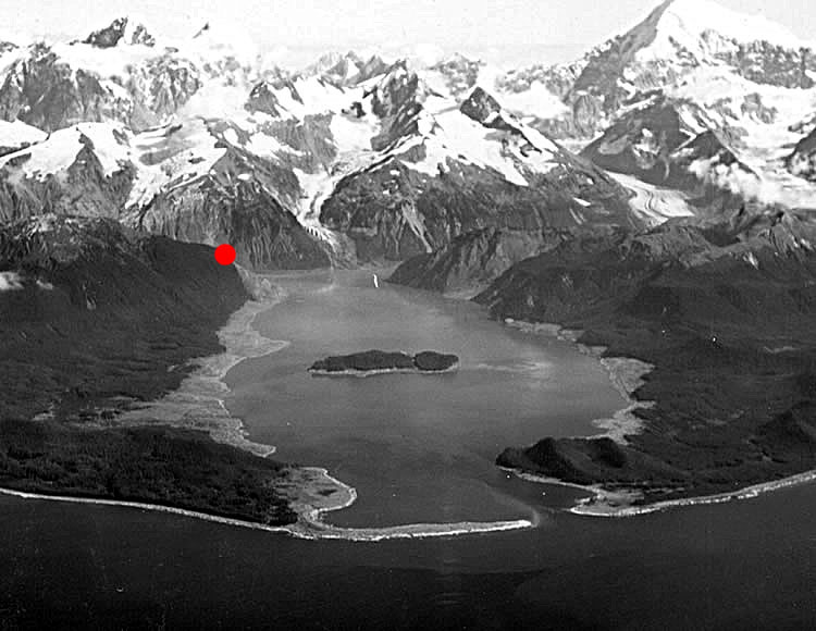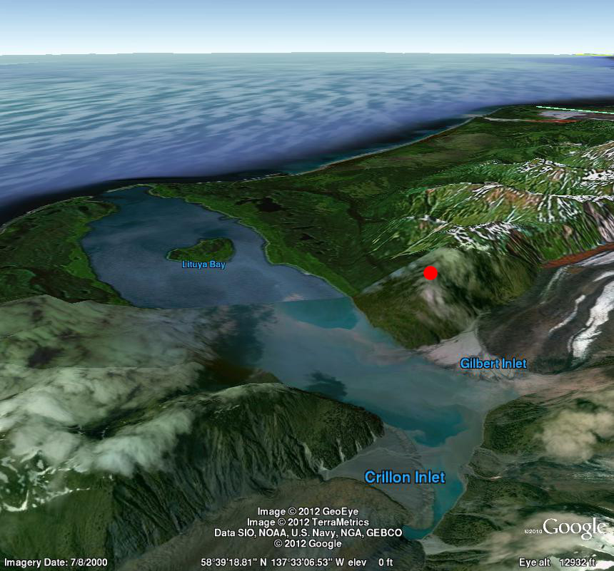 Figure 1: Lituya Bay (Google Earth). Red dot: "Tsunami mountain" high water mark, 1,720 feet (524 meters)