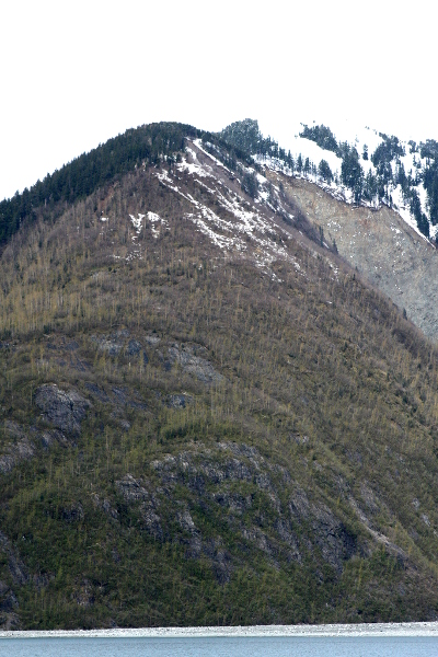 Because of the shape of the bay and landscape, the water in Gilbert Inlet couldn't simply move horizontally away from the landslide material — instead it was forced upward within the confining landscape. At one location, marked with a red dot in Figure 1, the water rose to a height of 1,720 feet (524 meters), stripping away the trees and vegetation along the way (a closeup appears as Figure 4 below). As the massive wave moved away from the head of the bay and occupied more area, its height declined, finally rising "only" 30 feet (9 meters) at the bay's entrance.