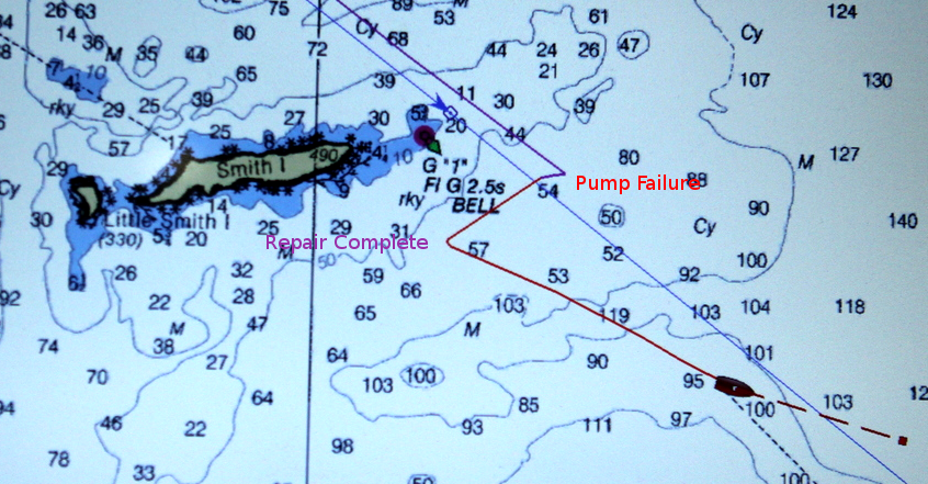 I had barely begun to think about what that might mean when I had my next fun surprise — the engine overheat alarm went off. On a boat like mine, you cannot allow the engine to run overheated, it will self-destruct, so I reluctantly shut down the engine. Now I'm adrift with a dead engine at the position marked "Pump Failure" in Figure 1.