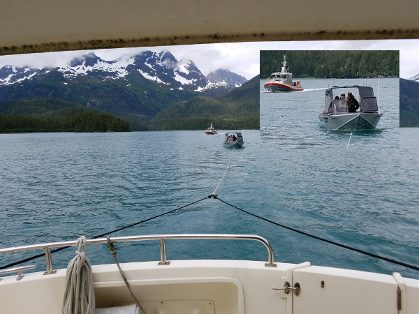 Tow setup just as the Coast Guard appears on scene (see magnified insert at right)As it turns out, the Coast Guard had overheard the original radio conversation and decided to investigate. Just as I began towing the disabled boat, they appeared on scene (see image above) and asked if I needed assistance. At this point I was more than ready to hand this boat over to anyone else, so I prevailed on them to take over the long tow to Valdez, which they were ready, not to say eager, to do.