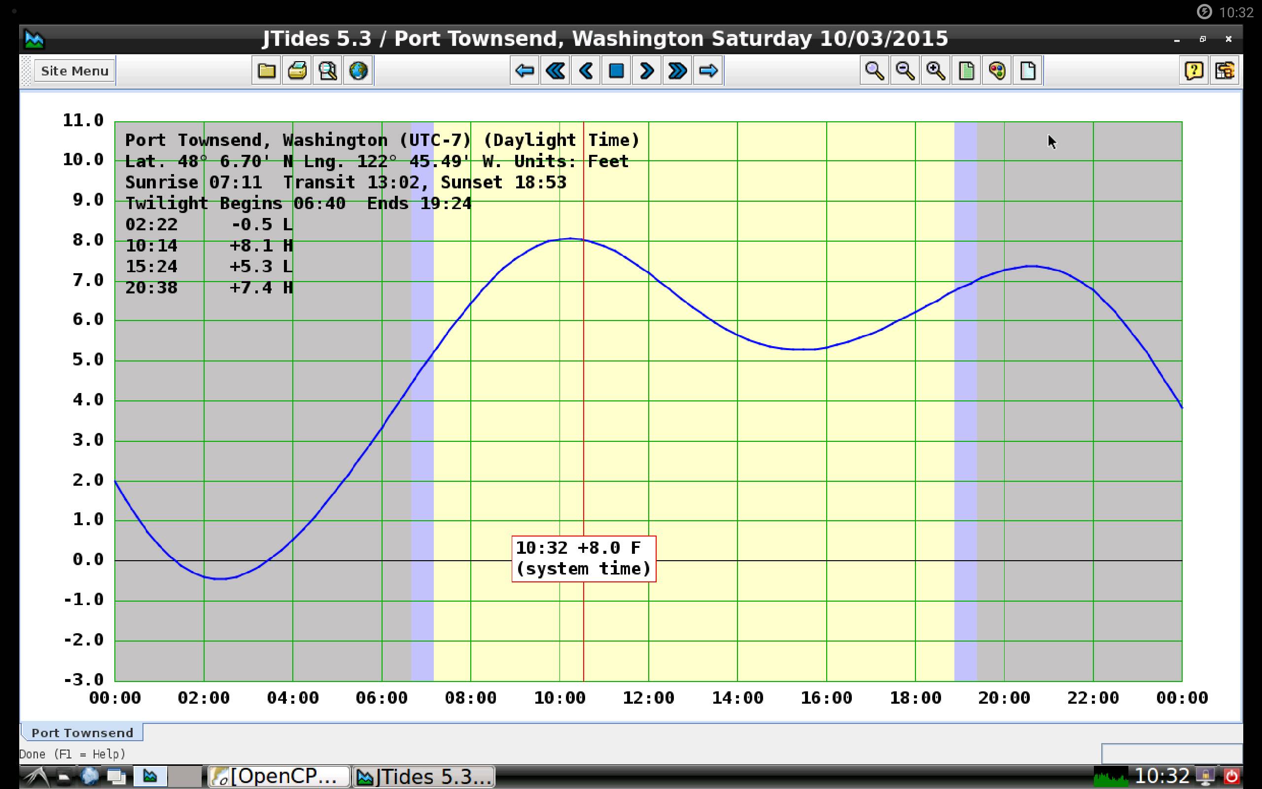 # apt-get install default-jreSimple, right? Now that I have Java available, alongside OpenCPN I can run my favorite tide prediction program JTides (which I wrote, and which is free).