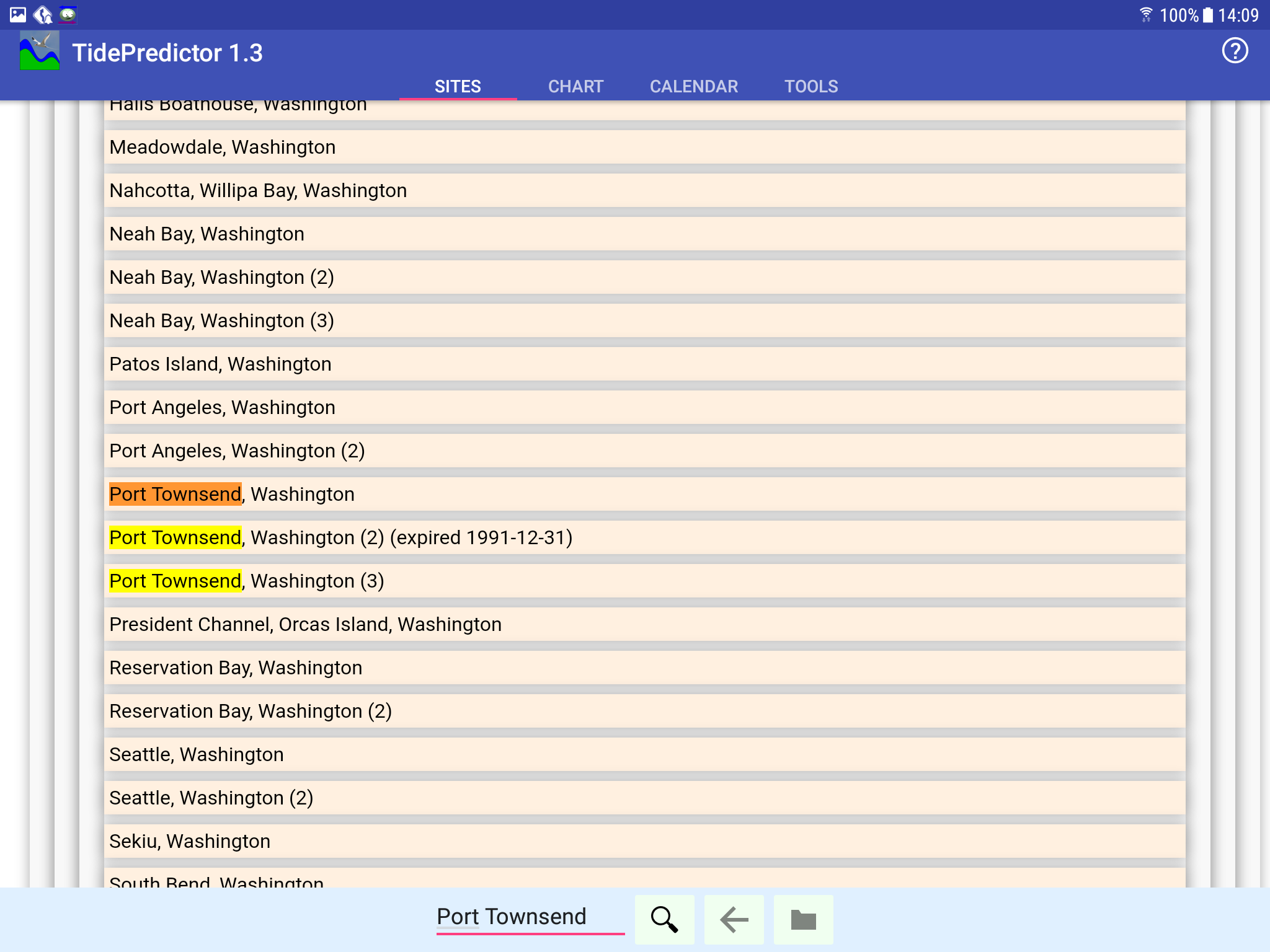 Press the "Enter Search" field at the top of the display and a soft keyboard will appear. Either type a name or (if your Android device is set up properly) you can speak the name you want. On my Android device, equipped with the now-standard voice-translation keyboard feature, I just said "Port Townsend" and got this result: