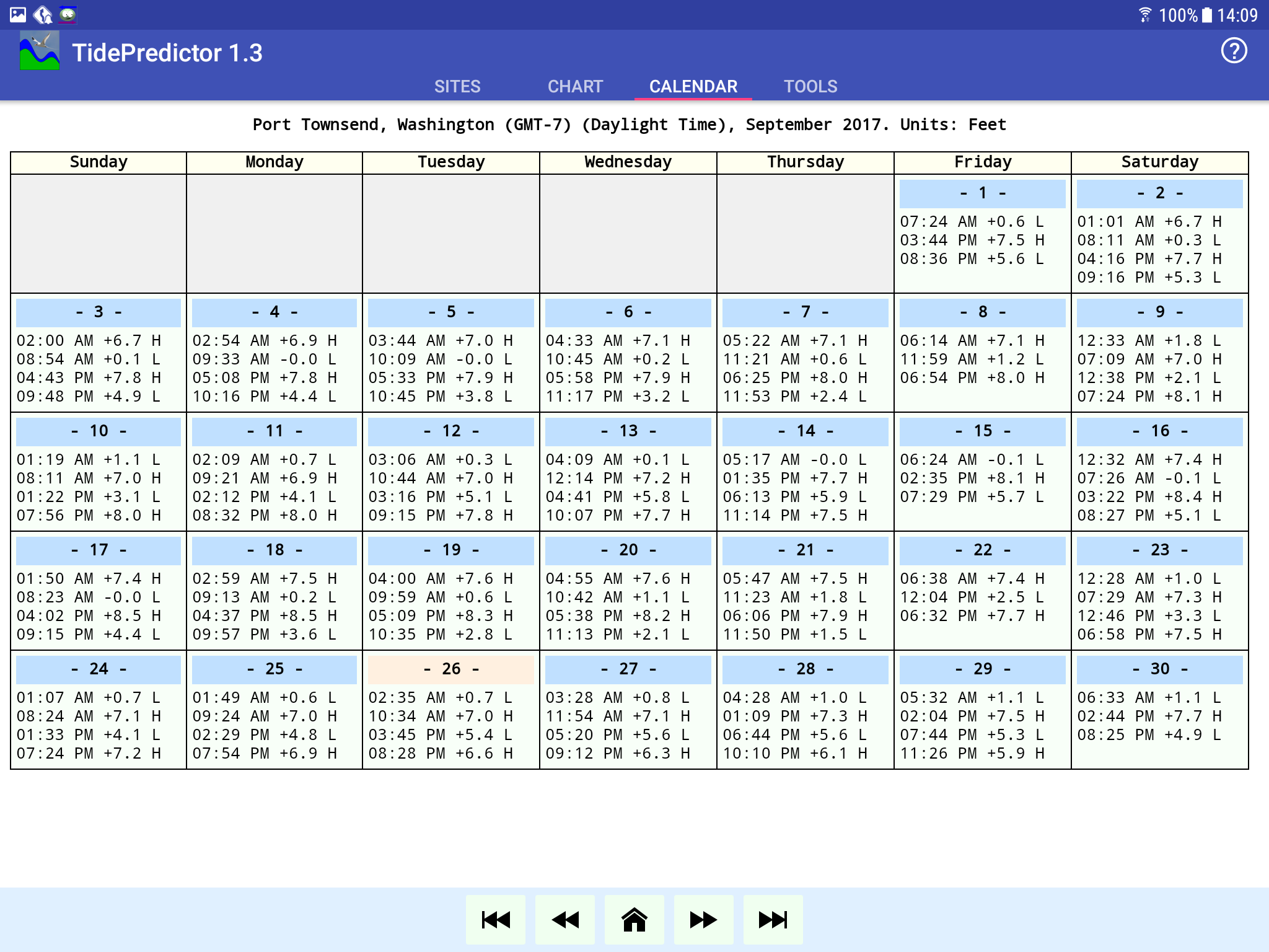 The calendar display's control buttons work much the same as for the chart display, except no day buttons. And to look at a detailed chart for a particular day, simply press one of the day squares on the calendar display — this will put that day on display in the chart tab.