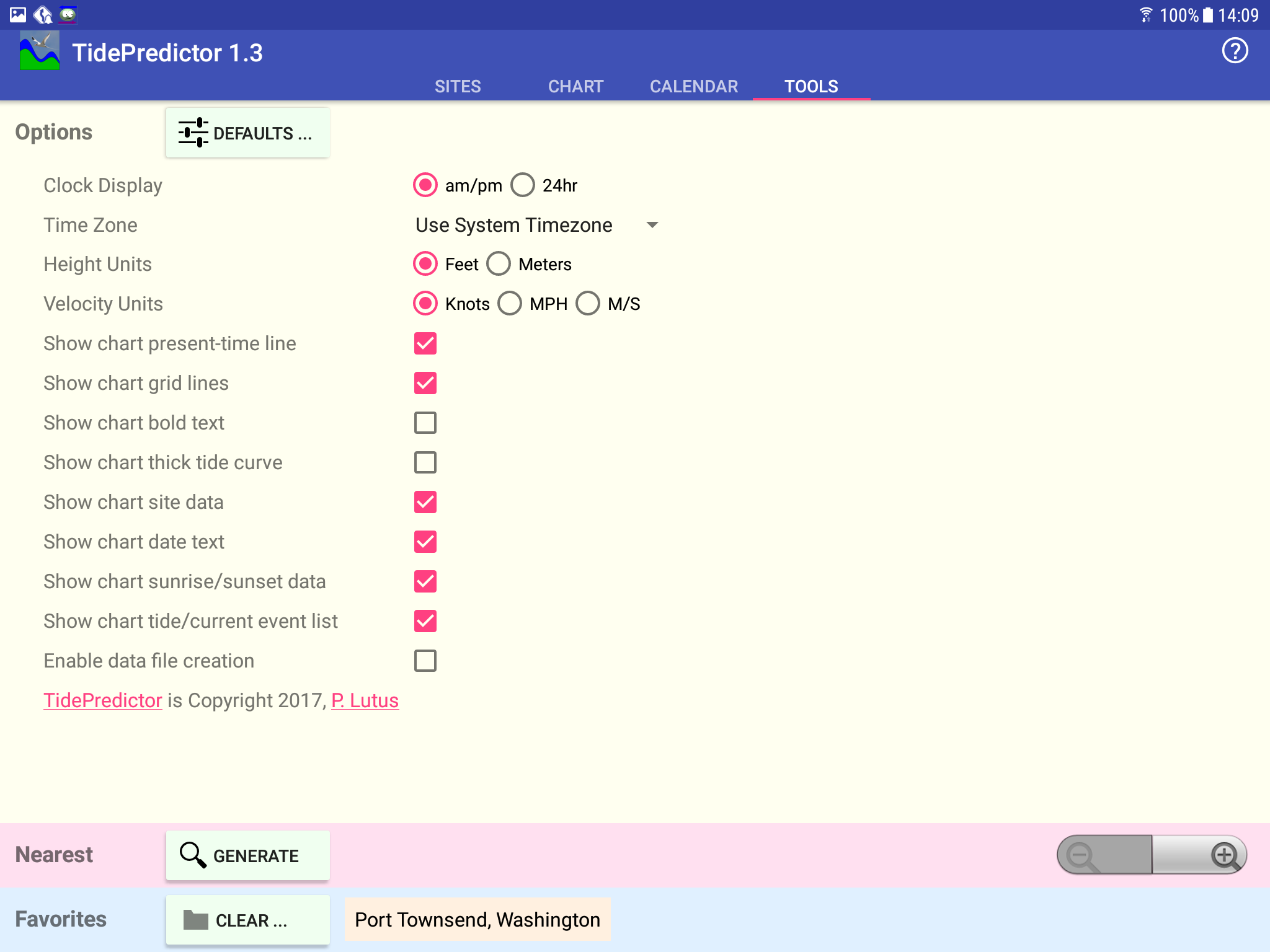 The last page in TidePredictor manages a list of favorite sites (sites you've visited in the past), a list of sites near the presently displayed location, and program configuration options. Swipe the calendar display to the left or press the "Tools" tab to see this: