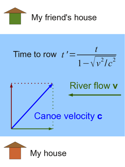 Figure 5: Rowing across a riverEquation (3) is the simplest expression showing the relationship between space and time — it shows that time is a dimension, much like the space dimensions, but it is treated differently — space intervals are subtracted from time intervals.