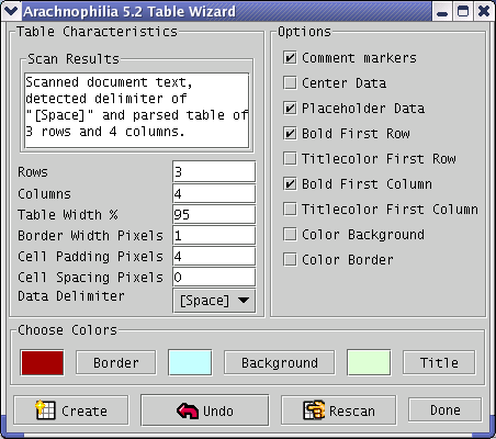 The Table Wizard examines the selected text and tries to figure out which delimiter is being used to separate the fields in your data — it usually guesses correctly. But if it doesn't, simply choose another delimiter with the "data delimiter" drop-down list and press "rescan" to make the wizard reevaluate the selected data.