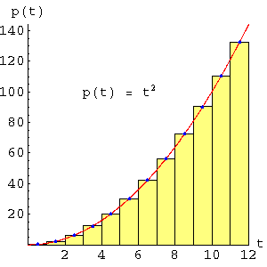 While examining Graph 4, pay attention to the rectangle at the right, the one lying between t = 8 and t = 12. Notice that a large part of this rectangle is above the function's curve (at the left), while much of the right side is below the curve. This may seem to undermine the goal of accurately estimating the area under the curve, until one realizes that the area outside the function's curve at the left may be thought of as a triangle, one that can be rotated clockwise through 180 degrees, pivoting around the blue dot at t = 10, and placed on top of the rectangle at the right. This same argument applies to the other rectangles, making them seem more appropriate as stepwise approximations of the curve's area than it may appear at first glance.