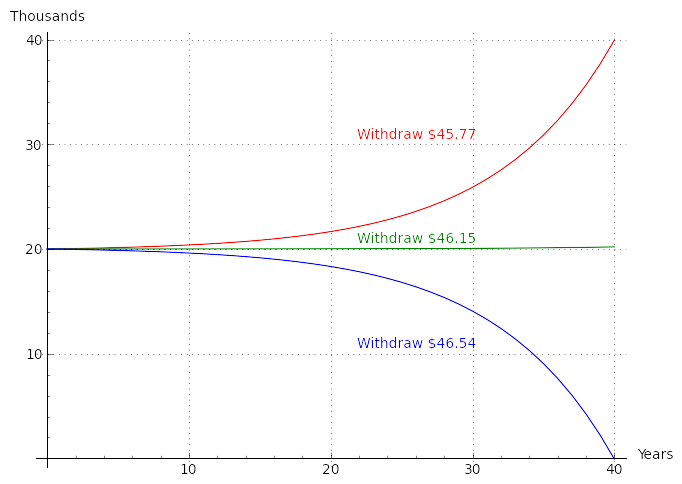 • If the withdrawal amount is increased by only 39 cents (less than 1%), to $46.54, the balance after 40 years will decline to zero.