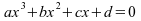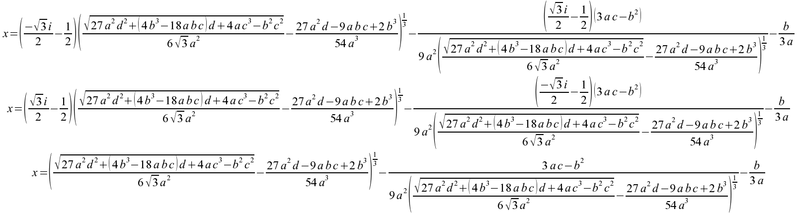 The general cubic equation has three roots and is formally soluble (click here to see how Maxima deals with it). This example revealed to me that, no matter how many variables one provides in a predefined form, there are never enough — the user has to type in a value for "d", and can use Graphinity's interactive features for a, b and c. Once you have the equation set up as you like, click the chart to estimate real root values (again, this method won't work for imaginary roots).