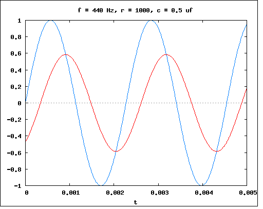 wxplot2d([sin(ω*t),f(t,r,c,ω,m)],[t,0,.005],[gnuplot_preamble, "unset key;set title 'f = 440 Hz, r = 1000, c = 100 uf'"]);