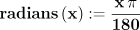 x %pi radians(x) := ----- 180