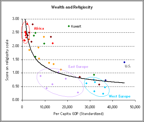 A recent Pew Research Center survey found a strong inverse relationship between a country's religiosity and its economic status (see chart this page). In poorer nations, religion remains central to the lives of individuals, while secular perspectives are more common in richer nations. As the chart shows, there are some outliers in the overall statistical pattern, notably the U.S. and some Muslim countries, where religiosity is anomalously higher than for the world at large.