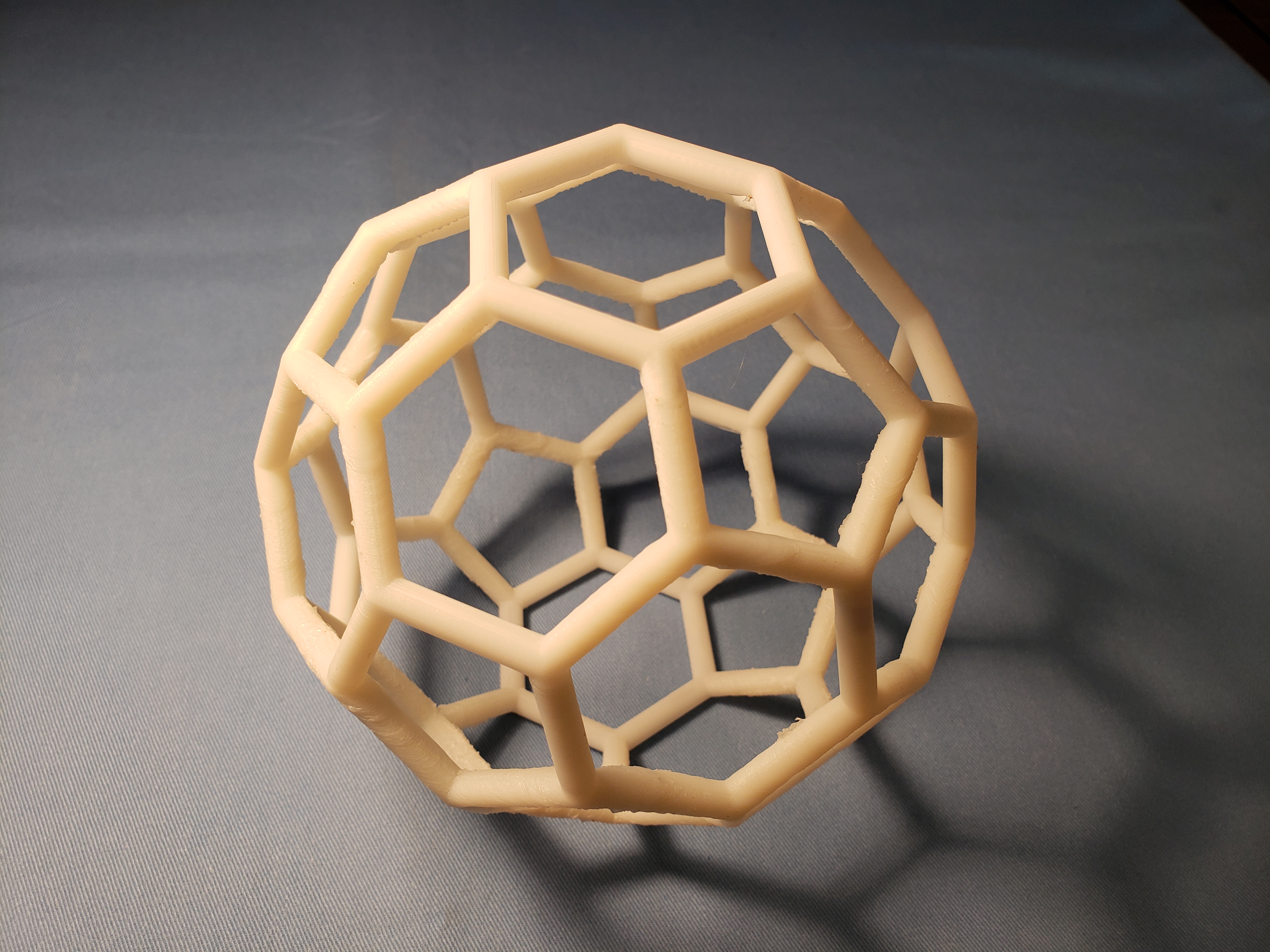 As one moves through this project's Platonic Solids files from the simplest to the most complex, one encounters more 3D printing challenges. But the most difficult object is the Buckyball, because of the number of edges (90) and the many acute angles some edges have with respect to the vertical. Only by careful printer tuning and good material choice can one get a reasonable outcome: