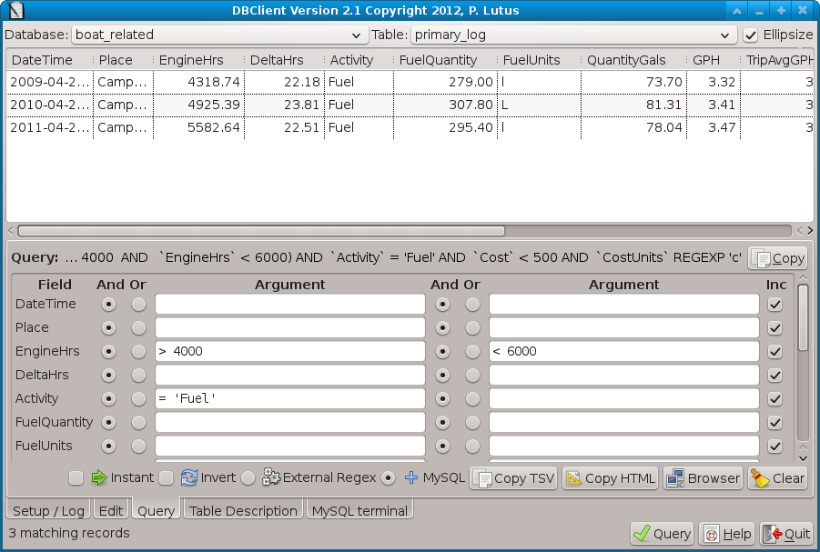 One DBClient query feature merits a detailed comment. The "External Regex" button on the "Query" tab redirects one's query entries to an external regular expression engine that is part of in Python, rather than using the regular expression engine built into MySQL. The advantage is thet, unlike MySQL, Python's regular expression processor understands some POSIX and Perl extensions, which can sometimes increase the descriptive power of a query. The drawback to using this feature is that it is much slower than running a pure MySQL query, because the entire table must be read and then submitted to an external regular expression processor.