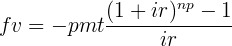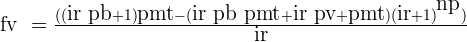 bffv = fv == ((pb*ir+1)*pmt-(ir+1)^np*((pb*ir*pmt)+pmt+ir*pv))/ir render(latex_spc(bffv),"base_fv_equation.png","large")![]()