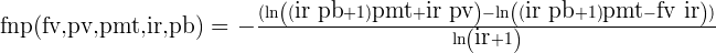 fstr = "fq(fv,pv,pmt,ir,np,pb)" for f in [fv,pv,pmt,np]: # make a string version of the target fs = str(f) # remove from the argument list # the variable this function defines s = re.sub("%s,?" % str(f),"",fstr) # insert the function's name at 'q' s = re.sub("q",fs,s) # solve for the specified variable soln = solve(bffv,f)[0].rhs().exp_simplify() # format a function with the solution eq = s + " = " + str(soln) # create the function in global namespace exec preparse(eq) in globals() # pretty-print the function pps = s + " = " + latex_spc(soln) show(pps)Some very helpful people at the Sage project explained how to create a function from a string describing it (e.g. "exec preparse(eq) in globals()") — I doubt I would have figured that one out on my own. Here's the result: