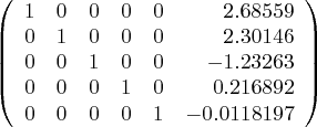 Astute readers will notice I have grafted a column onto the right side of the otherwise self-respecting square matrix in matrix (6) above. This column's purpose is to accommodate the particulars of the Gauss-Jordan elimination (GJE), and we initialize it with the values shown to the right of the equals sign in equation (4) above. At the end of the GJE this column will contain the desired polynomial terms. Here is the matrix with the data added: