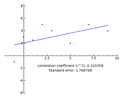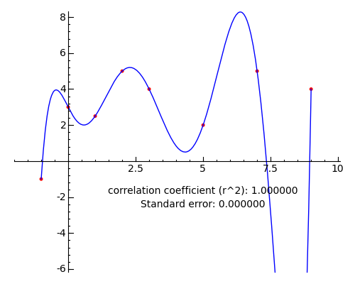 @interact def _(p = (0..12)): y = polyregress(data,p) dp = list_plot([[data[n].x,data[n].y] for n in range(len(data))],rgbcolor='red') lp = plot(y,x,list_minmax(data)) cc = corr_coeff(data,y) se = std_error(data,y) lbl = text("correlation coefficient (r^2): %f\nStandard error: %f" % (cc,se),(5,-2),rgbcolor='black',fontsize=10) show(dp+lp+lbl,ymin=-5,ymax=7)A degree 4 result: