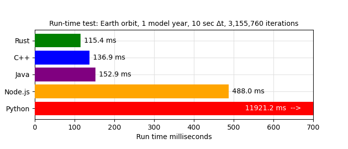 Model: Earth orbit Simulator step size Δt: 10.00 seconds Calculated/measured orbital parameters: Orbital radius meters: max (aphelion): 1.521000e11 min (perihelion): 1.470950e11 Orbital velocity m/s: max: 3.028790e4 min: 2.929125e4 Orbital energy joules (should be constant): mean: -2.649179e33 Simulation results: Iterations: 3155760 Orbital radius meters: max: 1.521000e11 min: 1.470950e11 Orbital velocity m/s: max: 3.028790e4 min: 2.929125e4 Orbital energy joules: max: -2.649179e33 min: -2.649179e33 error: 0.0000067% Elapsed algorithm time: 114.632 msThe runtime at the bottom of the list is from the Rust version of my program. To be regarded as valid and with the exception of runtime, each of the programs had to show the exact results as shown above, in particular the error value, which in the test series was the same for each program.